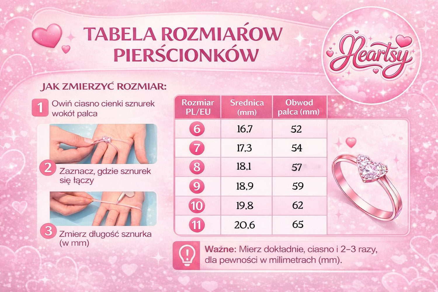 Na stronie produktu znajdziesz czytelną tabelę rozmiarów oraz instrukcję, jak zmierzyć palec w domu. Zalecamy dokładny pomiar w milimetrach.